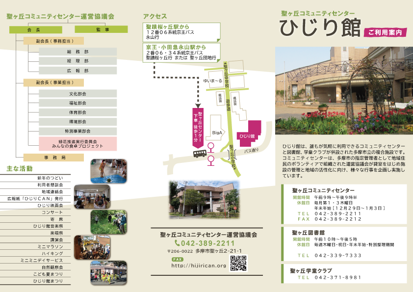 ひじり館は、地域の皆さんが集い、学び、交流できる東京都多摩市の複合施設です。 コミュニティセンターとして、様々なイベントや行事を開催しています。 お気軽にご利用ください。